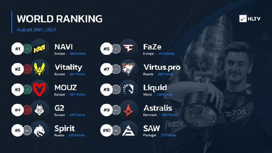 1-10名当中,Natus Vincere超越Vitality重回榜首,MOUZ也超越G2来到了第三名。6-10名当中没有任何变动。