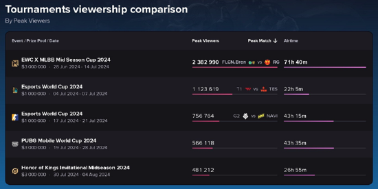 其中EWC X MLBB季中杯2024荣登榜首,峰值观看人数达到了283万人。