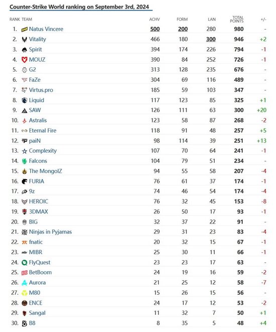 以下是截止2024年9月3日Top30队伍的榜单,相比于每周的世界排名,该榜单更详细的说明了以月为单位的积分变动情况。