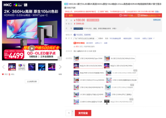 GS27QE的推出,进一步的完善了HKC天启系列的产品线,也为追求极致体验的玩家们提供了又一个新选择。目前该产品已在京东平台正式开启预售,9月13日付尾款,晒单还能再获500元E卡!实际到手价4499元,并支持6期免息,十分有竞争力!有兴趣的玩家不要错过了。