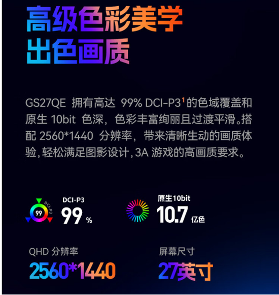 在显示器画质方面,显示器采用了2K的分辨率,相比4K分辨率来说,2K分辨率可以有效的降低显示器对显卡的性能压力,利于游戏更容易跑出更高的帧率。此外GS27QE还做到了对于影院级专业色域,99%的DCI-P3色域覆盖,搭配原生10bit的色深,这意味着GS27QE有着极为广阔的色彩范围。可以轻松满足专业设计工作和3A游戏的超高画质要求。GS27QE还通过了HDR 400认证,能够在支持HDR的视频和游戏中带来更强的画面表现,提升视觉冲击力。