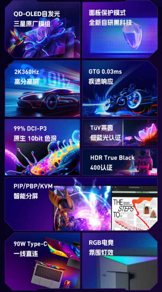 首先要关注的就是GS27QE的面板,根据HKC的介绍,这台旗舰级显示器所采用的是一块三星原厂自发光模组的QD-OLED面板,它不仅可以使显示的画面更加饱满生动,还带来了更加精准的控光效果和更加细腻的画质呈现。
