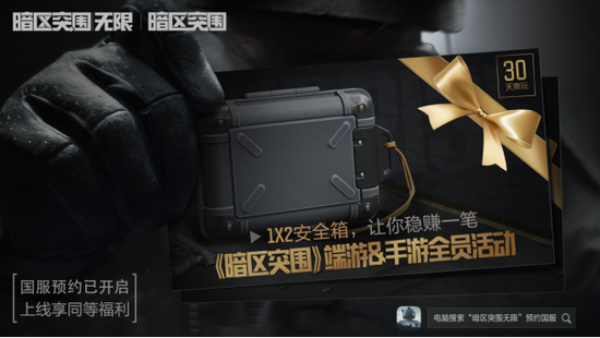 《暗区突围》端游&手游全球活动来袭,为全球暗区先锋奉上30天1*2安全箱!无论是端游玩家还是手游玩家、国服玩家又或者是国际服玩家,9月12日 - 10月14日期间,登录《暗区突围》手游或《暗区突围》端游海外版,游戏角色等级到达8级后即可领取,助力各位玩家稳赚一笔,暗爽一个月!