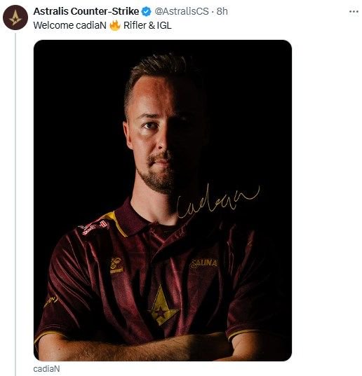 Astralis宣布招入了来自Liquid的cadiaN,即日起生效。