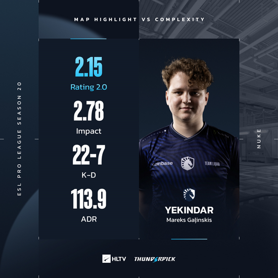 在刚刚结束的EPL S20 Liquid对阵Complexity图一Nuke上,YEKINDAR打出了自己CS新版本以来最好的单图数据,图一13-2碾压Complexity的过程中,狂哥砍下2.15的rating,2.78的Impact以及113.9的ADR。