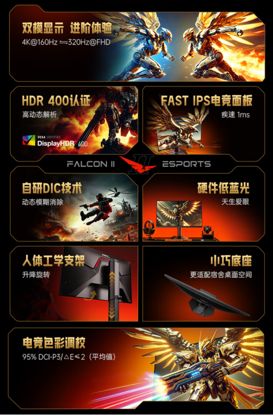 在外观方面,HKC G27H7Pro继续沿用猎鹰二代的经典设计,如红黑配色的猎鹰展翅背壳和小巧稳固的六边形底座,以及其支架设计充分考虑了人体工学原理,支持升降、旋转、俯仰等多向调节确保玩家能够找到最适合自己的观看角度,减少长时间游戏带来的疲劳感。同时,该显示器还支持硬件低蓝光,可缓解玩家们的眼睛疲劳,让游戏成为一种享受而非负担。