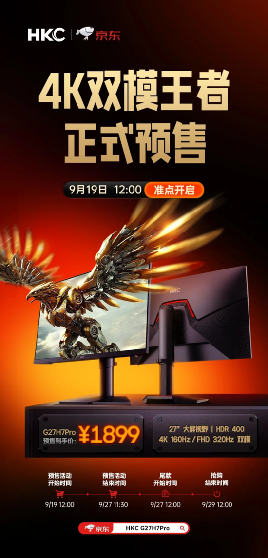 为了满足游戏发烧友们能同时在不同游戏和观影体验中都能拥有出色体验,国内一线显示器大厂HKC在近日正式推出了一款4K 160Hz&FHD 320Hz双模电竞显示器——HKC猎鹰二代G27H7Pro。这款显示器凭借突破常规的双模显示技术,以及一系列为游戏玩家量身定制的特性,重新定义了2000元内价位电竞显示器的新标准,为游戏玩家带来前所未有的沉浸式体验。目前它已在京东平台开启预售,9月27日前付尾款。首发价2499元,限时直降500元,预售用户参与晒单活动可抢100元E卡,到手1899元。