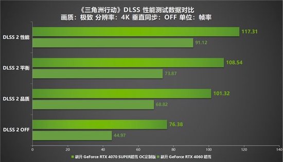 对于追求最高画质的玩家而言,4K分辨率才是最佳选择。如图所示,在4K分辨率下游戏所需配置要求极度升高。在关闭DLSS 2的情况下,即使是耕升GeForce RTX 4070 SUPER踏雪 OC定制版显卡,在不开启DLSS的情况下,平均帧数也下降到了76.38帧。而耕升GeForce RTX 4060 踏雪更是只能达到平均44.97帧,难以流畅运行游戏。但通过开启DLSS 2,耕升GeForce RTX 4070 SUPER踏雪 OC定制版在性能模式下能够保持平均117.31帧的帧率;耕升GeForce RTX 4060 踏雪也能够达到平均91.12帧。