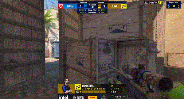 来到NAVI的选图,MOUZ先防守。手枪局他们顶B1和小道,torzsi先收暗道但是B1被NAVI清空,稳了一波后NAVI出A大顺利拿下手枪局。成功拿下3分后进入长枪局,NAVI先默认转中夹B,MOUZ判断正确大狙收掉过路费顺利拿分。丢分之后NAVI也起进攻狙,w0nderful的A大首杀和小道架回防帮助NAVI继续拿分。w0nderful的大狙持续拿分,NAVI气势如虹,MOUZ这边A大的xertioN持续被逮捕NAVI的进攻展开十分顺利,无限的首杀无限的拿分,半场他们取得10-2的领先。