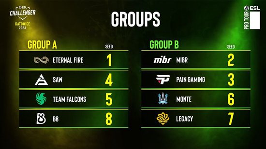 ESL已经公布了将举办于卡托维兹的10万美元奖金挑战者赛分组情况。Eternal Fire作为最高排名的种子队参赛,与SAW、s1mple所在的Falcons和B8一起被分到了A组。