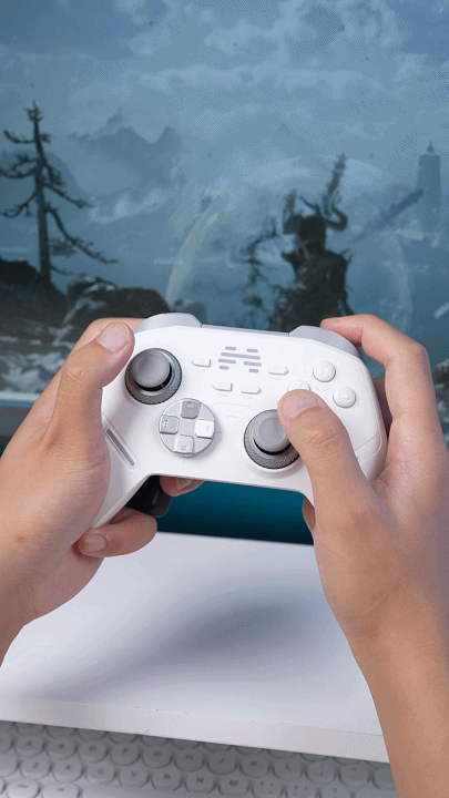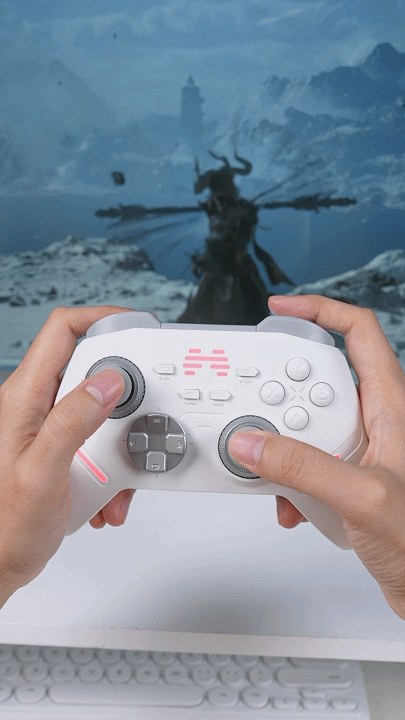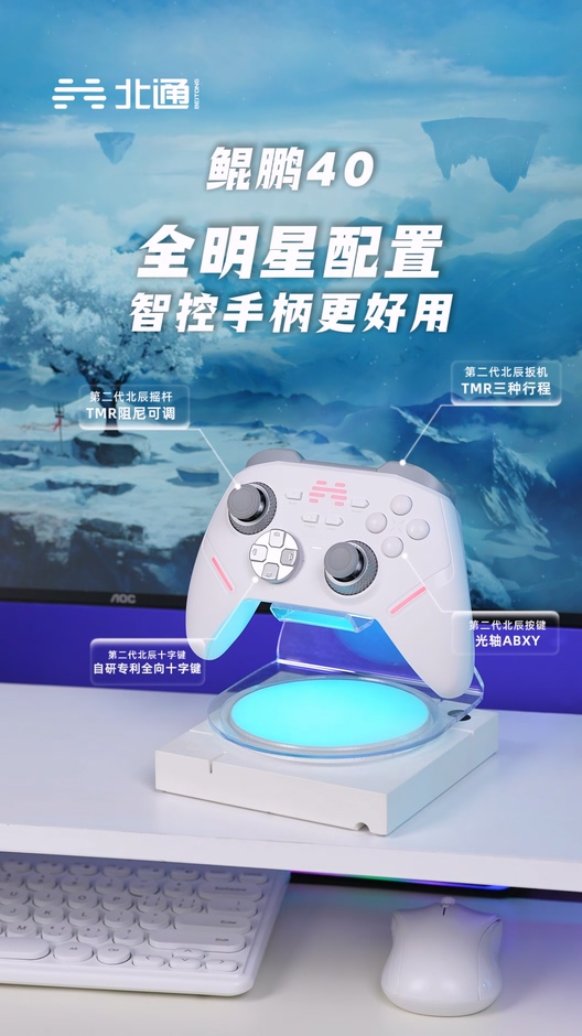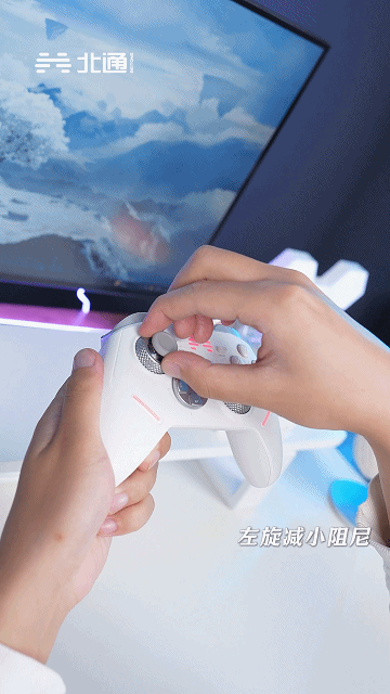北通鲲鹏40采用了素雅的“汉玉白”配色,外壳满满全是细节,譬如摇杆帽和握把背面都雕刻了国潮防滑纹,握持特别稳,怎么玩都不会脱手。