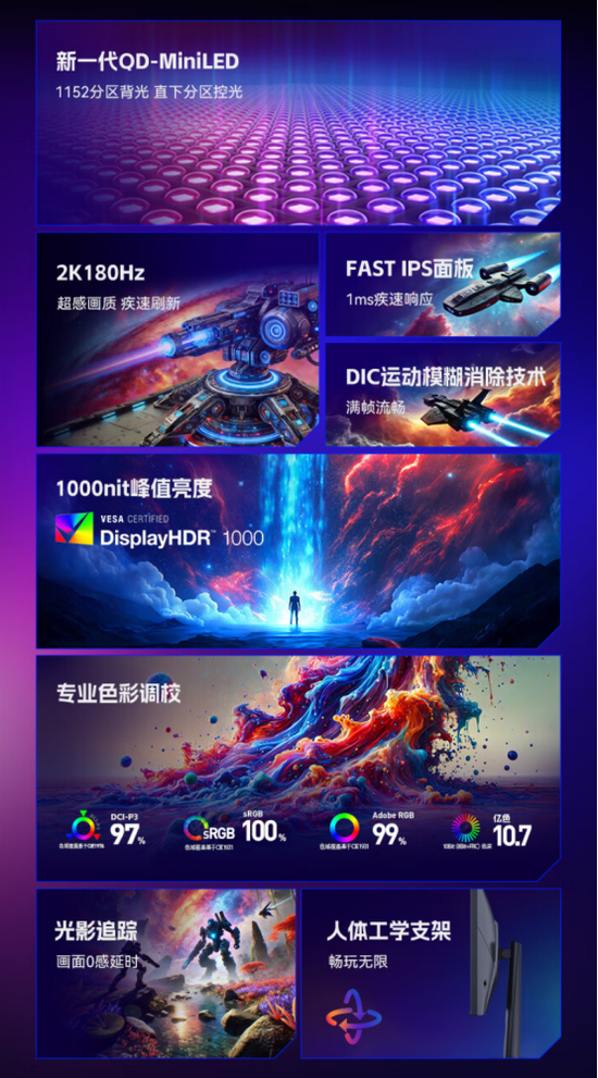 传统背光技术在显示效果上存在诸多局限性,尤其在低价位品类,往往会出现色彩不均、对比度低、漏光等问题。而QD-MiniLED背光技术通过采用大量背光分区的形式,精准控制每个区域的亮度,能够在显示画面时,让亮处更耀眼,暗处更深沉。HKC G27M2显示器采用了新一代QD-MiniLED背光的FAST IPS面板,共设有1152个背光分区,峰值亮度可达1000尼特,可以精准还原游戏场景每一处细节,色彩层次丰富且过渡自然。