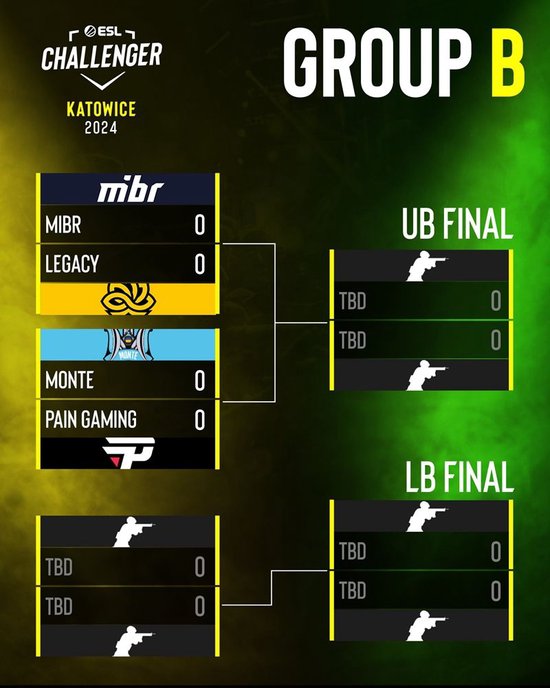 而ESL小组赛的B组揭幕战中,Monte战队首战将会对阵paiN,具体时间为10月25日晚上20点。而B组的另一场揭幕战将由MIBR战队迎战Legacy。获胜的战队将晋级小组胜决,而败方将跌落败者组,迎接小组赛败者组决赛的挑战。