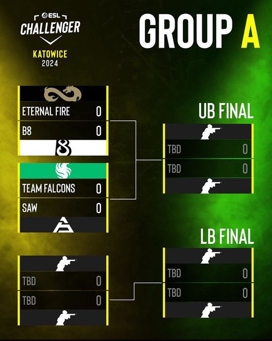 而今天ESL公布了小组赛的揭幕战对战表。s1mple所在的Falcons战队首战将会对阵SAW,具体时间为10月25日晚上19点。如果能够击败SAW,那么Falcons将会面对Eternal Fire和B8之间的胜者。
