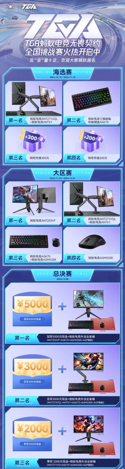 此外,蚂蚁电竞还为本届大赛提供了丰富的奖品。其中,海选赛和大区赛的前四名均有奖励,包含蚂蚁电竞高端电竞显示器、机械键盘、电竞鼠标,以及不同金额的网吧充值额度。而在总决赛中胜出的前三名,更有丰厚的现金奖励及蚂蚁电竞外设全家桶,对于玩家来说可谓吸引力十足。