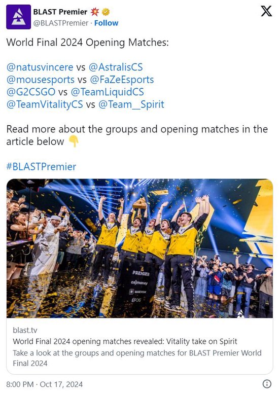 BLAST宣布了2024年世界总决赛的分组与赛程。