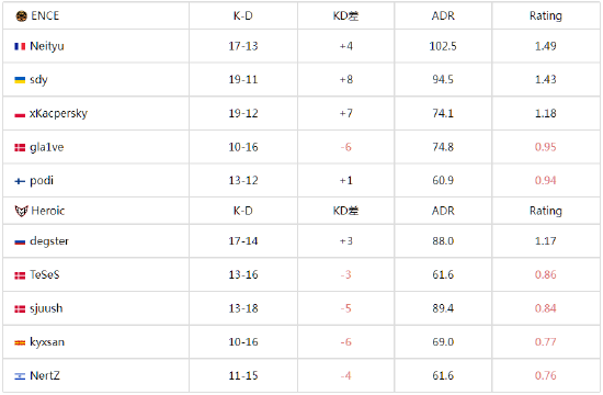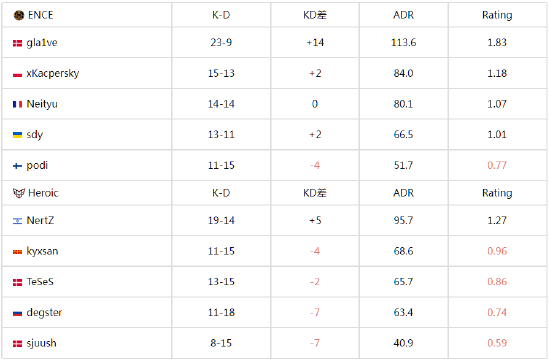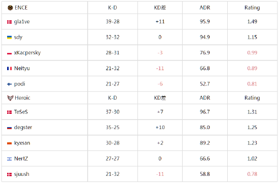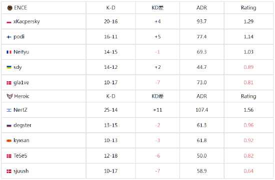 图二为Heroic选择的Nuke,好在ENCE没有受到图一被翻盘的影响,在图二这张大防守图上打得较为轻松,上半场ENCE仅让Heroic拿下2分,攻防转换后ENCE同样拿下手枪局,手握十个赛点的他们最终以13-7赢下图二,将大比分扳平。