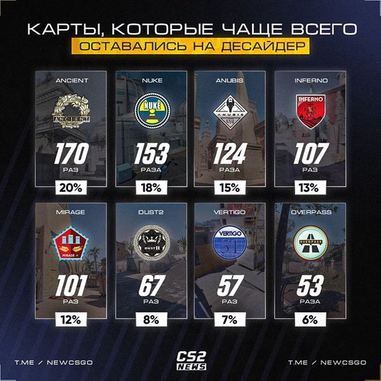 根据统计,半年内的所有一线、二线赛事中,现役最受欢迎的地图是Ancient,选取率达到了20%(170张图),而无人问津的则是Vertigo,以7%(57张)的选取率排名倒二,倒一则是早早被移出比赛地图的Overpass。