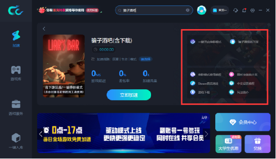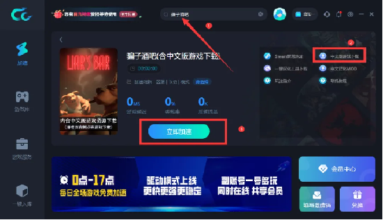 端游加速教程:打开CC加速器PC电脑版---搜索“骗子酒吧”---点击右侧【中文版游戏下载】---点击【立即加速】