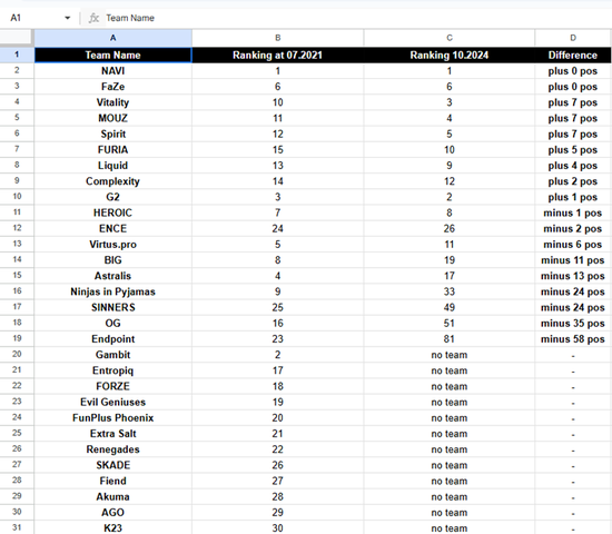 今天有CSer整理了2021年7月的Top30战队情况,结果发现其中近半数战队(12支)已经告别了CS。