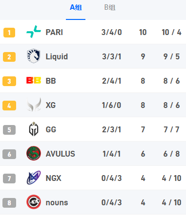 梦幻联赛S24小组赛一阶段结束,两支中国战队XG晋级,AR被淘汰,最终小组赛积分如图。
