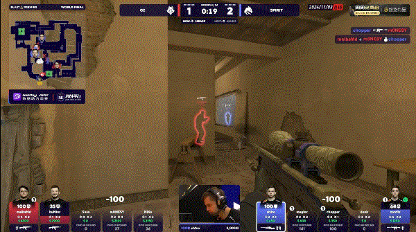 BLAST 世界总决赛 2024 决赛,G2对阵Spirit,前两张图G2发挥非常不错,都是在下半场直接锁住比分拿下胜利。进入图三后G2上半场先做进攻方就拿到8-4领先,换防过后再次收下手枪局,后续虽然被Spirit追上几分,但是状态火热的m0NESY没有给他们任何机会,最终以13-7赢下比赛。