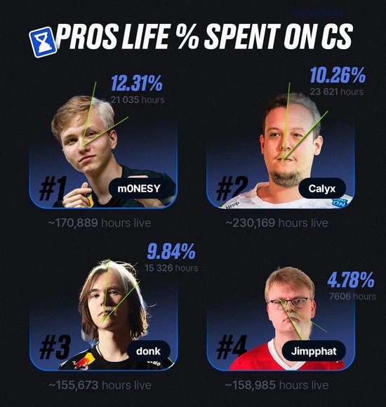 近期,有社区用户统计了选手们游戏时间相对于他们人生的占比,其中m0NESY以12.31%的惊人领先榜单。这代表他人生的八分之一时间是在CS中度过的。
