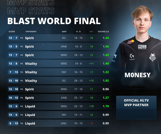 随着G2在BLAST 世界总决赛的决赛中3-0击败Spirit,HLTV也随之公布本届赛事的MVP选手,G2的明星狙击手m0NESY获此殊荣。这也是m0NESY在今年第三次获得HLTV颁布的MVP奖牌。