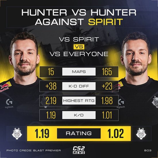 随着G2战胜Spirit夺得BLAST世界总决赛冠军后,G2已经连续四次击败Spirit,这其中与队内步枪手huNter-的发挥有着重大关系。在对阵其他队伍时,huNter-似乎表现平平,有时甚至会因为个人表现不佳葬送大好局面。但每当遇上Spirit时,他总会化身猎人助力队伍拿下胜利。据统计,在对阵Spirit时,他有着1.19的平均rating,远高于对阵其他队伍时的1.02 rating。