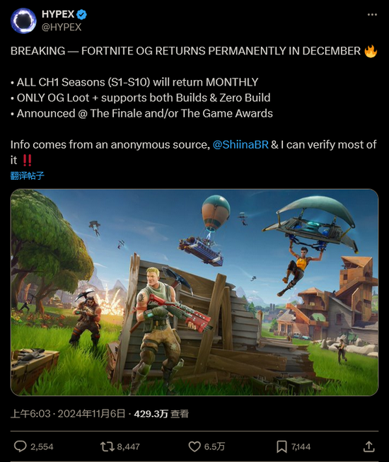 该消息来自著名《堡垒之夜》泄密者 HYPEX 和 ShiinaBR。根据泄露称,游戏的“第一章节”所有赛季内容均将回归,每个赛季在该模式中将持续 1 个月时间;在该模式中,仅有原版游戏的物资,后续更新的武器和道具将不存在。