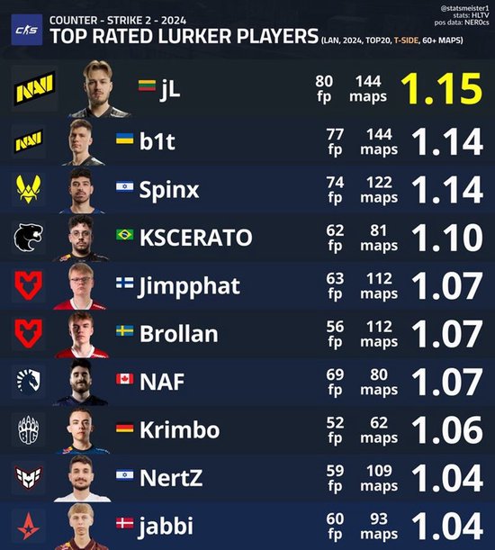 结果看,jL是最棒的进攻方自由人,他在144张地图上有着1.15的rating;b1t排名第二,有着1.14的rating;第三名是Vitality选手Spinx,122张图1.14 rating。传统自由人ropz榜上无名。