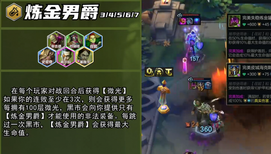 羁绊方面,这个赛季也是有小伙伴们最喜欢的收菜天赋,叫做炼金男爵,每回合不管输赢都能叠菜,不过连败叠的会更多,100层之后就能打开黑市,获得炼金男爵的加强装备等奖励,也可以不收菜,继续叠加。