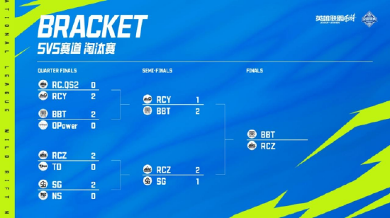 5V5赛道的比赛吸引了全国范围内的强队争夺总冠军席位,经过各大赛道的层层选拔,八支队伍来到总决赛现场。首日的Bo3淘汰赛中,RCY和RCZ战队表现尤为突出,凭借出色的团队协作与战术意识晋级下一轮。次日比赛更加紧张激烈,BBT、OPower、SG和NS四支队伍展开了正面对决,尤其是BBT与SG,这两支队伍在8进4的比赛中展现了非常强大的统治力,两队都表现出极高的操作水准和出色的战术执行力。不过,在随后的半决赛阶段,依旧是BBT与RCZ更胜一筹,他们都以2-1的总比分分别击败对手,携手晋级决赛!