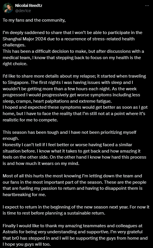 在个人社交媒体上,这位丹麦狙击手的动态透露,在队伍最近前往新加坡参加BLAST Premier世界总决赛期间,他曾因健康问题而被迫休息。