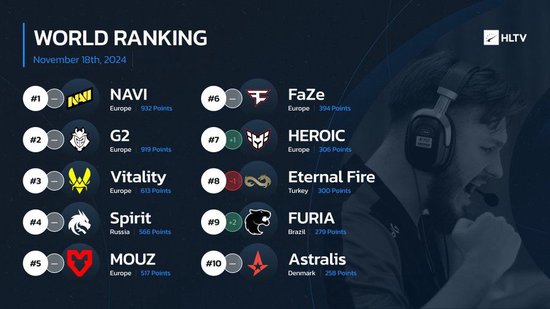 1-10名中冠军宝座不变,依旧是Natus Vincere战队。不过NAVI战队和G2战队的分差缩小,如今只领衔G2 13分。剩下的战队中The MongolZ跌出前十,FURIA回归Top10行列。HEROIC上升一位。