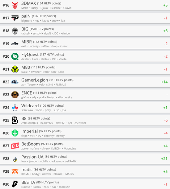 11-20名中3DMAX和BIG战队引人瞩目,他们的世界排名分别上升5名和6名。两支队伍在欧洲RMR中也展示出了不错的势头。