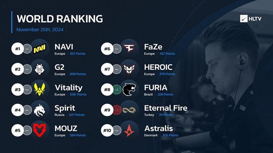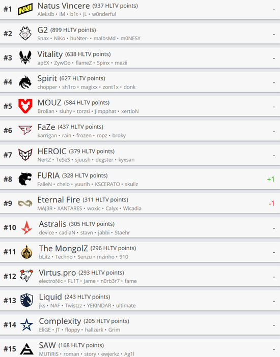 1-10名中Natus Vincere依旧占据第一的宝座,他们和G2的分差也拉大到了38分。前七名没有任何变动,到第八名的时候FURIA和Eternal Fire互换位置。