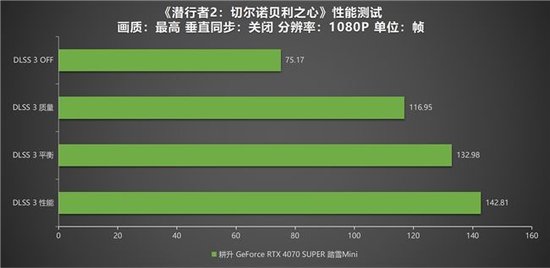 在1080P分辨率的测试中,耕升 GeForce RTX 4070 SUPER 踏雪 Mini显卡展现出了其卓越的性能。游戏在DLSS 3性能模式下能获得平均142.81帧的成绩,让玩家能够享受到高清视觉体验以及流畅的游戏体验。