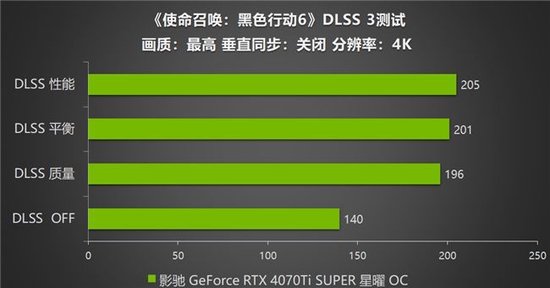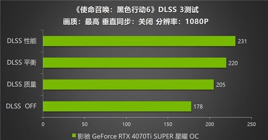 通过游戏实测可得出,《使命召唤:黑色行动6》在开启DLSS 3技术后,帧数得到显著提升。在1080P分辨率下,使用影驰GeForce RTX 4070Ti SUPER 星曜 OC,DLSS性能模式帧数达到了231,相较于未开启DLSS的178帧,有明显的提升。而在DLSS平衡和质量模式下,帧数也分别达到了220和205帧,能够轻松兼顾游戏画质和流畅度,充分展现了DLSS 3的强大性能优化能力,为玩家带来了更顺滑的游戏体验。