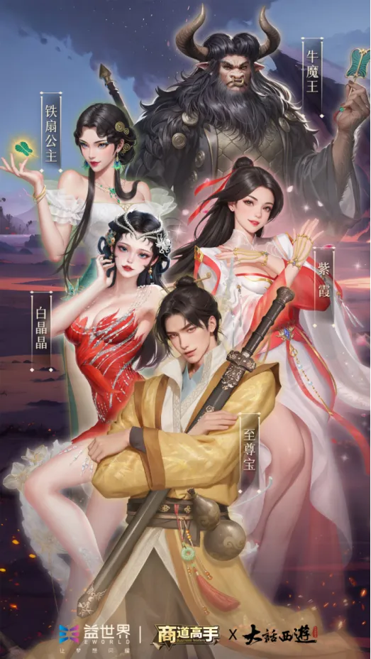 本次联动中,《大话西游》电影里的经典角色——至尊宝、紫霞、白晶晶、铁扇公主、牛魔王,将跨越时空之境,来到《商道高手》的游戏世界中,与广大玩家朋友们共贺新岁。