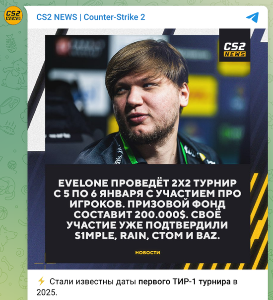 日前主播Evelone表示将会举办一场CS赛事,该赛事采用2v2赛制,奖池为20万美元。