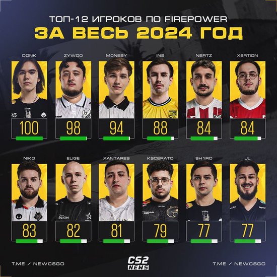 NiKo以83的火力值排名第七,未能进入前五,而Natus Vincere队员jL和Spirit队员sh1ro在今年都打出了77的火力值排在该榜单末尾。
