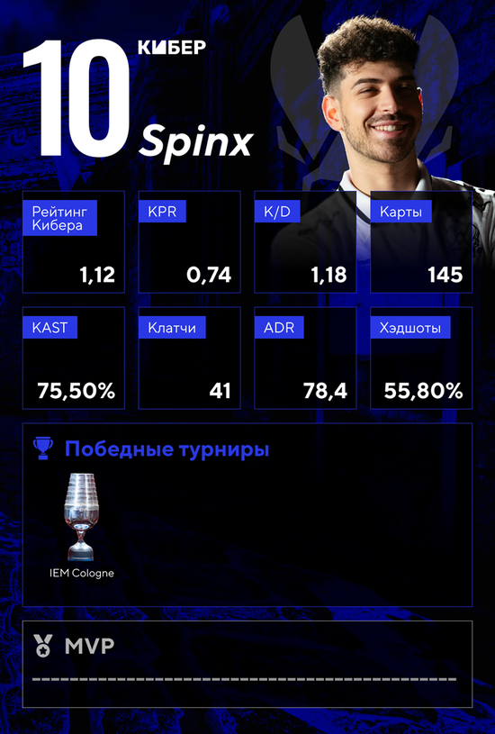 Spinx连续第二年进入最佳选手前十名。然而,在2023年他排在第六名,今年他却只勉强挤进了TOP10榜单的最后一名。统计数据几乎没有变化,唯一的差异是他的评分从1.13下降到了1.12。不过,Vitality在2024年整个赛季仅赢得了一项赛事——IEM 科隆,而在这场赛事中,Spinx在总榜单中仅排在第七名,评分为1.21。