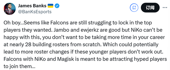 “看来Falcons仍在艰难地争取锁定心仪的顶级选手。Jambo和ewjerkz表现不错,但NiKo对此恐怕不会满意。年近28岁,没人想在职业生涯中再花时间从头组建阵容。要是这些年轻选手表现不佳,很可能会导致阵容进一步变动。Falcons有NiKo和Magisk,本应能吸引备受瞩目的选手加入…… ”