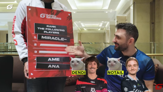 GH:第一位是Ame,考虑到我不知道其他选手是谁,先放在第三名吧。下一位是Ana,这谁啊?开个玩笑,我还是把他排在第二名吧。然后是Miracle-,当然排在第一,其他选手跟他相比还差得远呢(随后GH将Ame与ana的排名进行了下调)。下一位是N0tail,再下一位是Dendi,但排名板上好像没有第五到六名,所以我不能把他们排上去,原因你懂的。