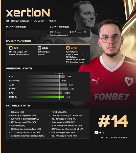 xertioN对自己在2023年未能入选TOP20名单后,表示努力付出得到了回报感到非常高兴他凭借三个EVP排名第14位,其中一个EVP来自MOUZ在IEM 成都站的亚军,另外两个EVP则是他们在EPL S19和BB别墅杯 贝尔格莱德站中的连续夺冠。