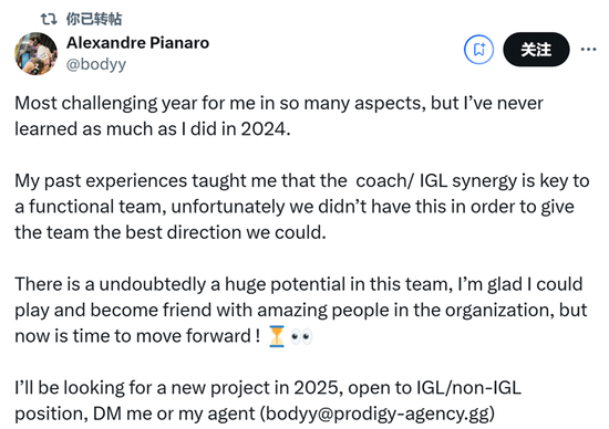 2025年,我将寻找新的项目,无论是游戏内指挥还是其他非指挥位置,我都愿意考虑。请直接私信我,或联系我的经纪人(邮箱:bodyy@prodigy - agency.gg)。 ”