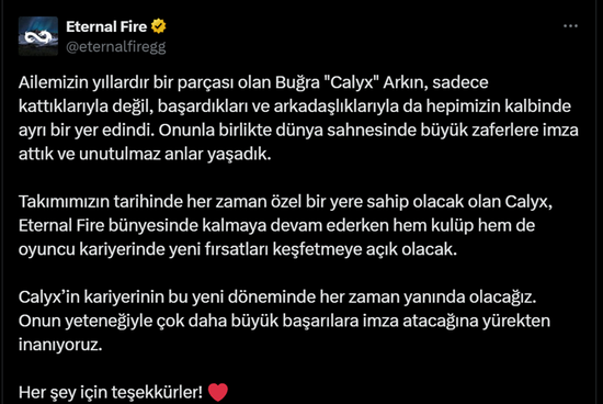 Calyx在效力Eternal Fire三年后让位给了年轻的新成员。在这段时间里,Eternal Fire从最初一支世界排名接近20的队伍,发展到了2024年在哥本哈根Major晋级八强,并在EPL-S20中惜败Natus Vincere获得亚军,创造了队伍新的历史。