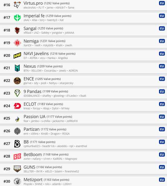 PGL克鲁日 - 纳波卡站也将依据此次排名更新发出邀请,排名前16的队伍将有机会参加这项奖金为125万美元的赛事。