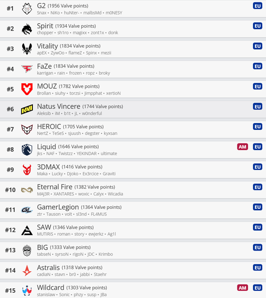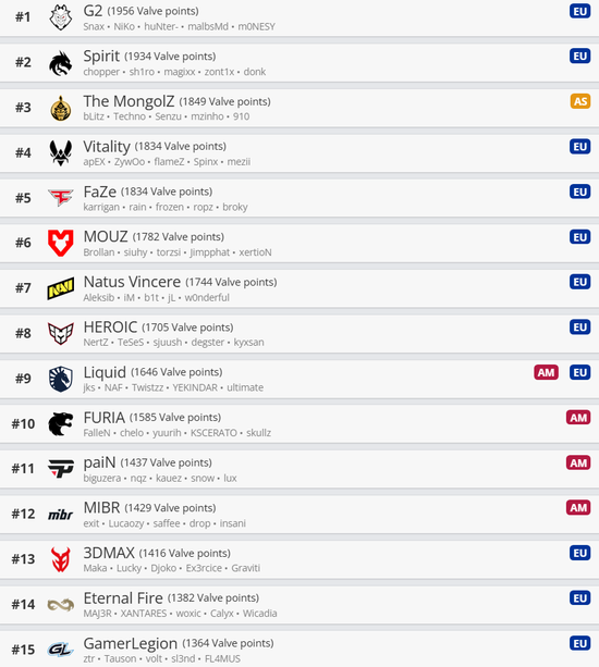 在此次排名中,Major冠军Spirit战队升至第2位,而The MongolZ战队在中国表现出色位列第3位。与此同时,Natus Vincere战队因在上海Major未能进入淘汰赛,下滑至第7位。